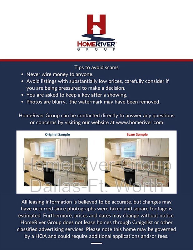 HomeRiver Group does not advertise properties on Craigslist, LetGo, or other classified ad websites. If you suspect one of our properties has been fraudulently listed on these platforms, please notify HomeRiver Group immediately. All payments related to leasing with HomeRiver Group are made exclusively through our website. We never accept wire transfers or payments via Zelle, PayPal, or Cash App. Lease your home safely through www.Homeriver.com or with the assistance of a licensed HomeRiver Group leasing agent. All leasing information contained herein is deemed accurate but not guaranteed. Please note that changes may have occurred since the photographs were taken. Square footage is estimated.