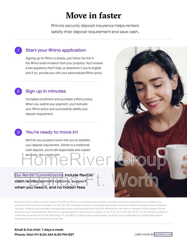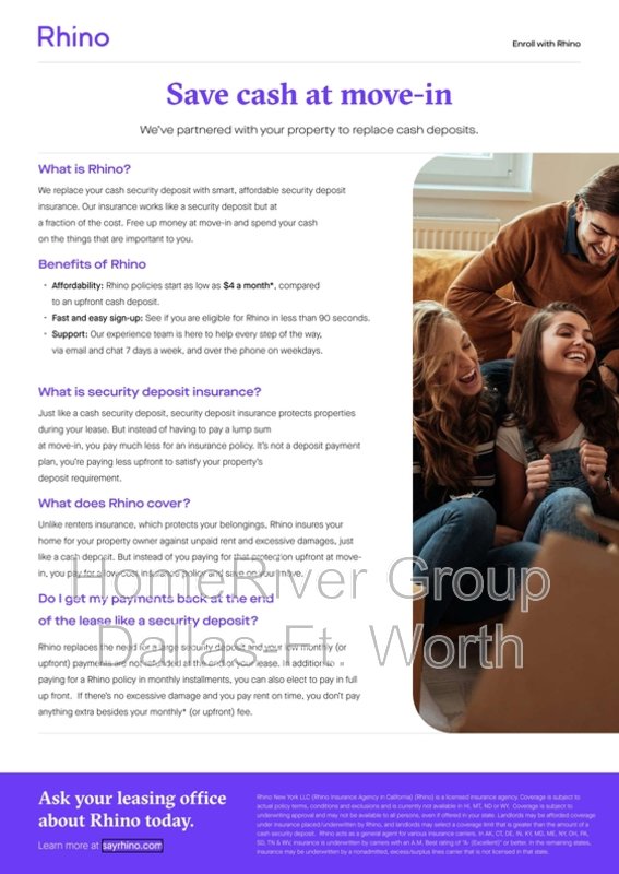 Home River Group has partnered with Rhino to offer an affordable alternative to upfront cash security deposits. Approved residents can choose between paying a security deposit equal to one (1) months rent OR purchase a deposit replacement policy with Rhino at a fraction of the upfront cost. For more information, visit www.sayrhino.com.