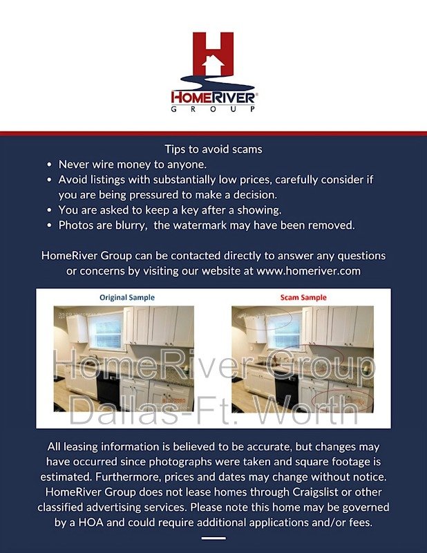 HomeRiver Group does not advertise properties on Craigslist, LetGo, or other classified ad websites. If you suspect one of our properties has been fraudulently listed on these platforms, please notify HomeRiver Group immediately. All payments related to leasing with HomeRiver Group are made exclusively through our website. We never accept wire transfers or payments via Zelle, PayPal, or Cash App. Lease your home safely through www.Homeriver.com or with the assistance of a licensed HomeRiver Group leasing agent. All leasing information contained herein is deemed accurate but not guaranteed. Please note that changes may have occurred since the photographs were taken. Square footage is estimated.