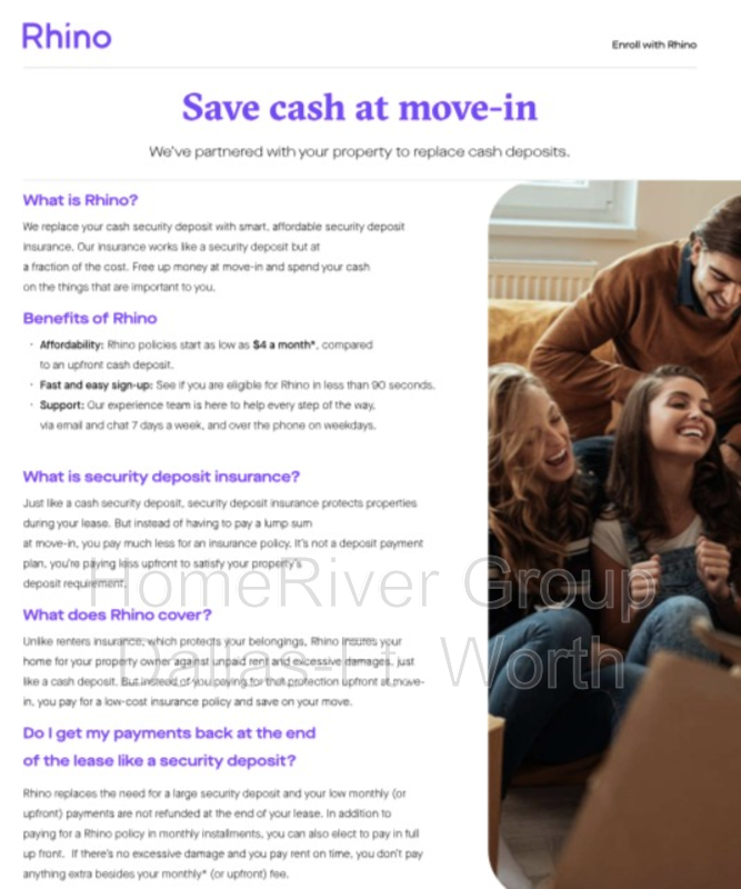 HomeRiver Group has partnered with Rhino to offer an affordable alternative to upfront cash security deposits. Approved residents can choose between paying a security deposit equal to one (1) months rent OR purchase a deposit replacement policy with Rhino at a fraction of the upfront cost. More information can be provided upon request.