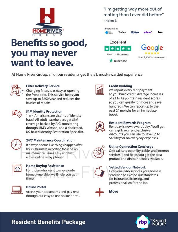 All HomeRiver Group residents are enrolled in the Resident Benefits Package (RBP) for $39/month. This includes a move-in concierge service to make setting up your utilities and home services easier, $1M identity protection, a top-tier resident rewards program, credit building with on-time rent payments, and HVAC air filter delivery (where applicable). More details are available upon application.