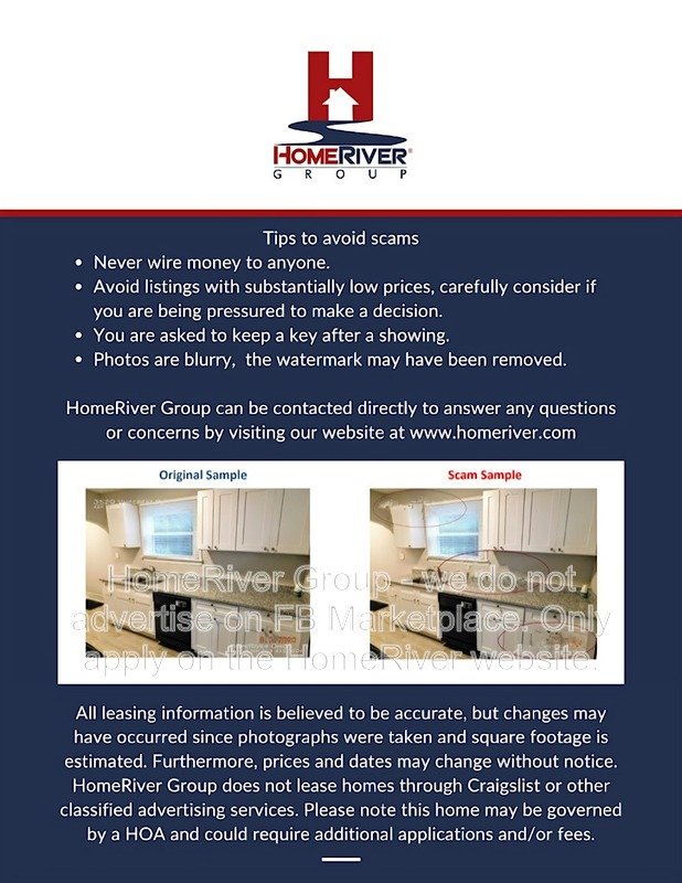 HomeRiver Group does not advertise properties on Craigslist, LetGo, or other classified ad websites. If you suspect one of our properties has been fraudulently listed on these platforms, please notify HomeRiver Group immediately. All payments related to leasing with HomeRiver Group are made exclusively through our website. We never accept wire transfers or payments via Zelle, PayPal, or Cash App. Lease your home safely through www.Homeriver.com or with the assistance of a licensed HomeRiver Group leasing agent. All leasing information contained herein is deemed accurate but not guaranteed. Please note that changes may have occurred since the photographs were taken. Square footage is estimated.