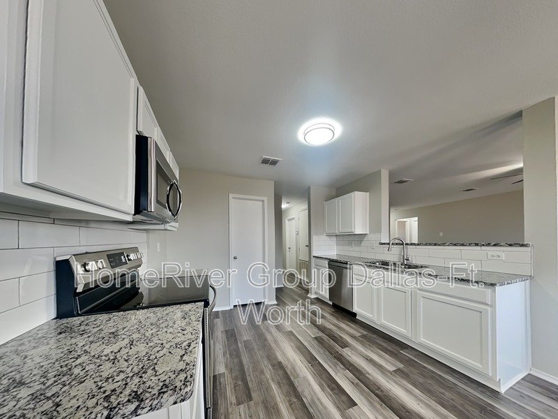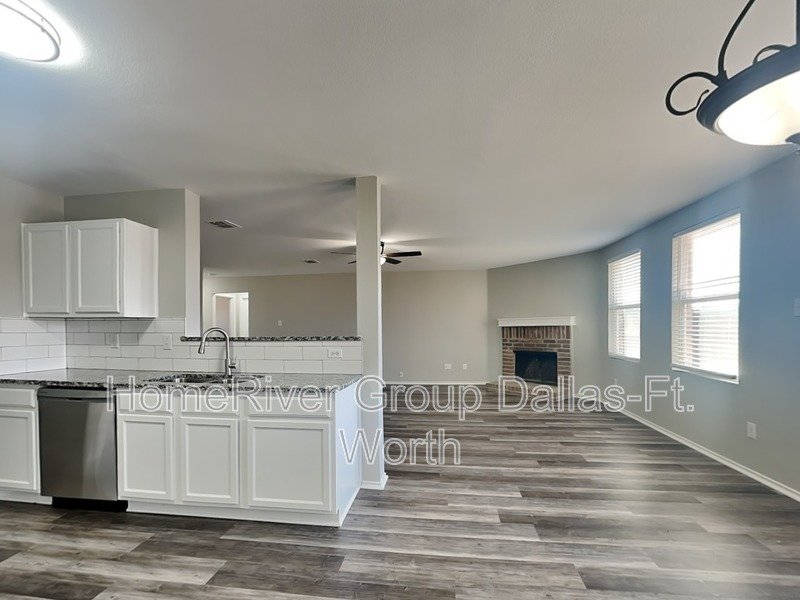 Fantastic 3-bedroom, 2-bath home in Rockwall ISD! The living room features vinyl flooring and a fireplace. The spacious kitchen is equipped with granite countertops, stainless steel appliances, including a built-in microwave, and a convenient walk-in pantry. The primary suite offers dual sinks, a separate shower, and a walk-in closet. Two additional bedrooms with carpeting and generous closet space. Step outside to a large fenced backyard with an open patio. Completing the home is a two-car garage for added convenience.